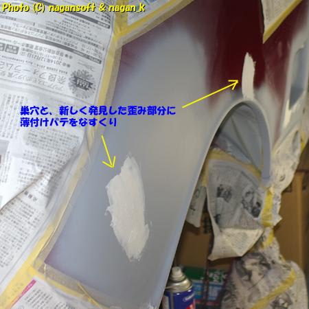 新しく発見した歪み部分も含めて、薄付けパテをなすくりです。