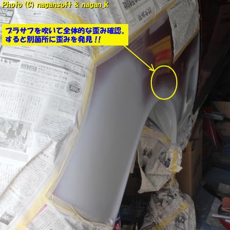 前回はプラサフを吹いて終了しています。一晩経って、しっかりプラサフが落ち着いている状態で光をすかすようにして歪みの確認です。