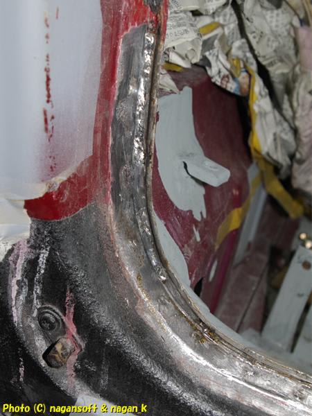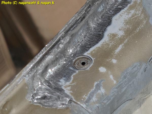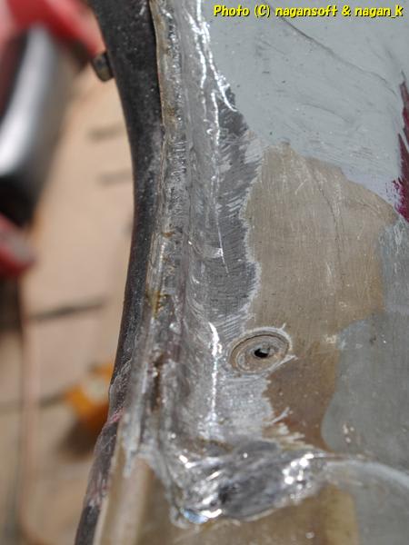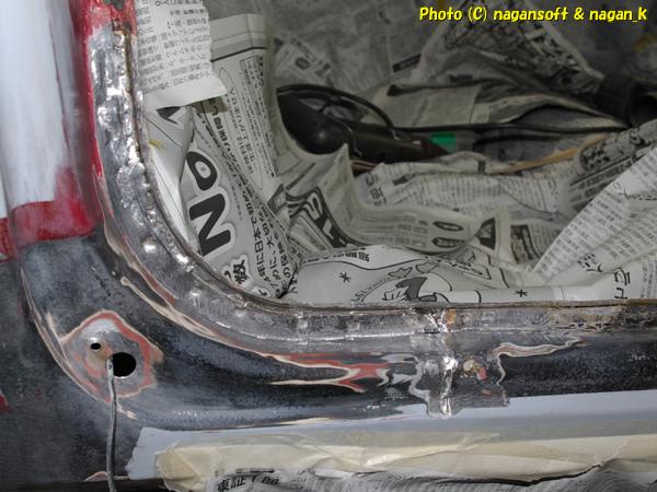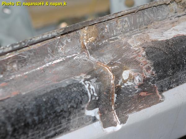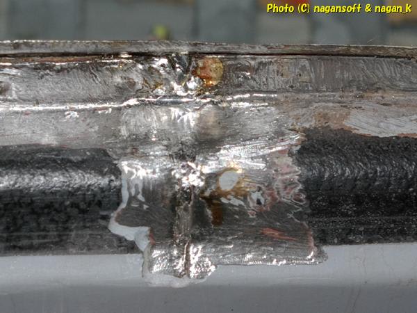 右サイドシル上端の鉄板合わせ部分に、まずはハンダを流して封印しました。