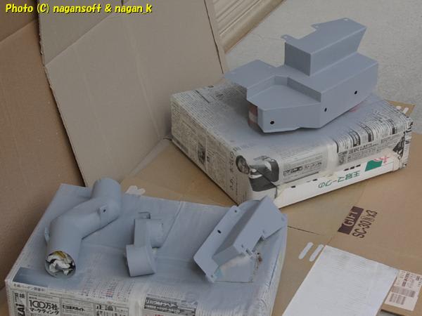 簡単にプラサフと書いてますが、最初の下塗りになりますので、足付けにサンドペーパーで磨いて脱脂して、塗装するためにダンボールを用意したりするのに1時間ぐらいかかってます。