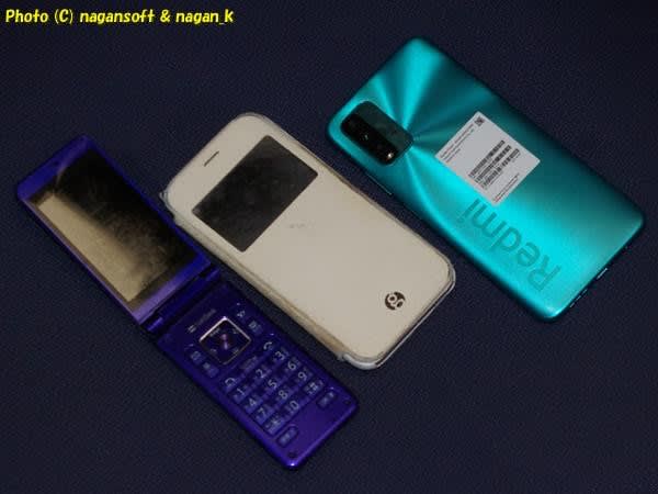 左から、二つ折りガラケー(先月解約)、今も使用中のアンドロイド5のスマホ(データ通信専用シム)、先月契約した音声シムのスマホ。