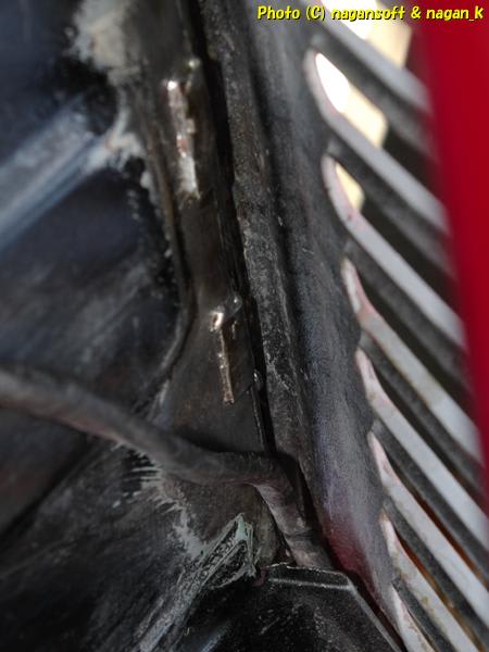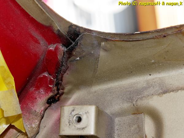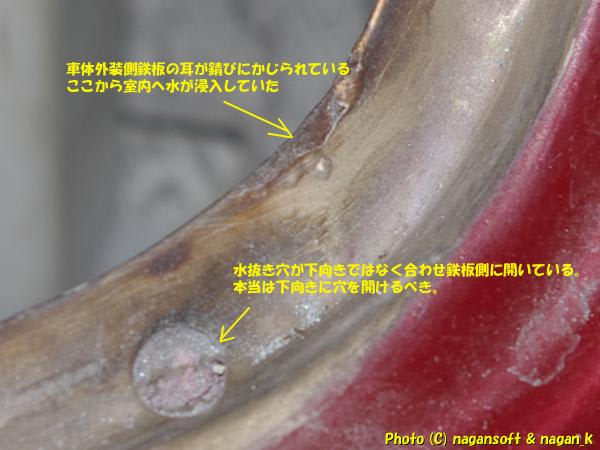 右下コーナーになるのですが、輪郭が錆びにかじられてます。水抜き穴も間違った方向に開いてます。