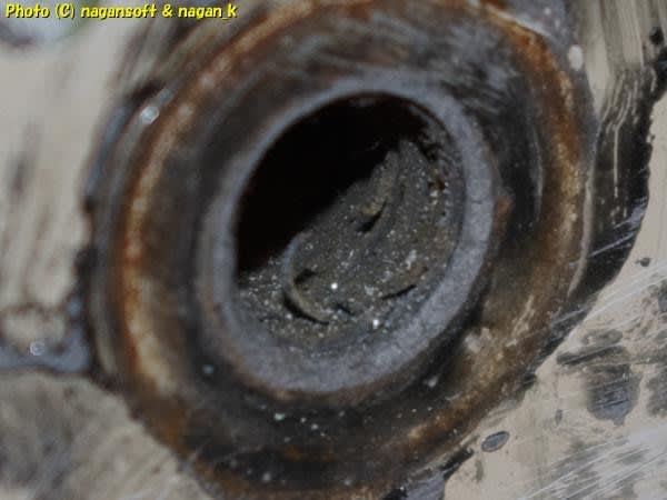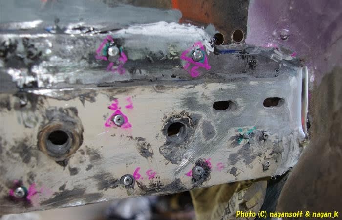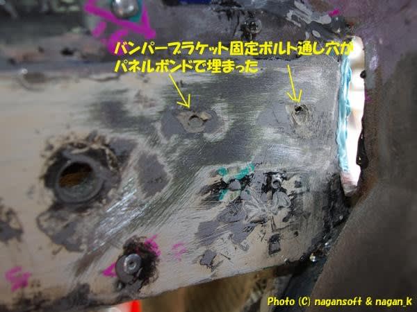 同じくフロンドバンパーブラケット固定ボルト通し穴がパネルボンドで塞がっているのですが、今日は研磨掃除している時間がありません。