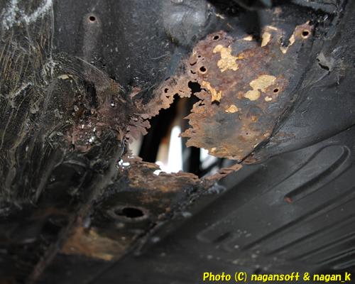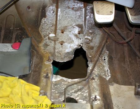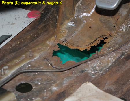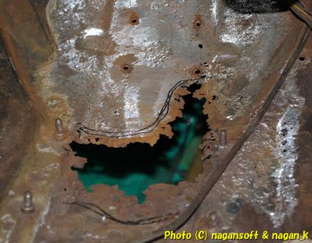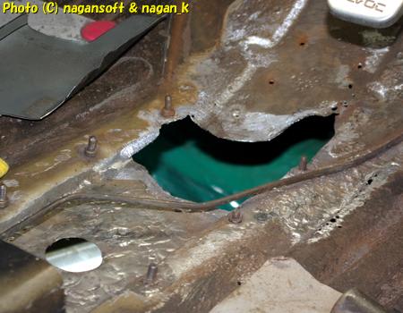 室内側からのサビ穴です。パッチ鉄板がなくなったので巨大サビ穴の全貌があらわになりました。