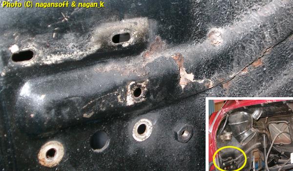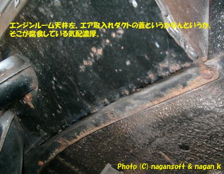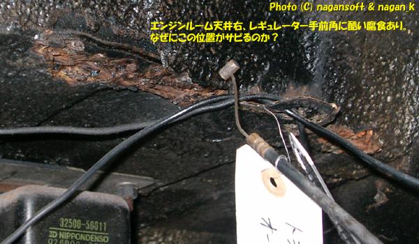 エンジンルーム天井右、レギュレーター手前角に酷い腐食あり。なぜにこの位置がサビるのか?
