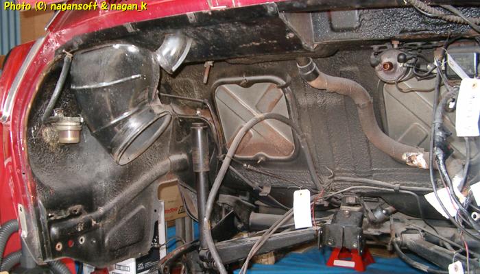 フロントへ延びるホース。室内へのヒーターダクトかな?これの直径が62mmぐらい。長さは車体下へもぐらないといけないので今回は計測せず。