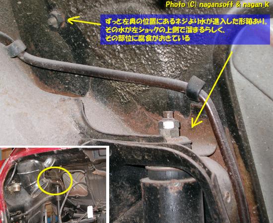 ずっと左奥の位置にあるネジより水が進入した形跡あり。その水が左ショックの上側で溜まるらしく、その部位に腐食がおきている。