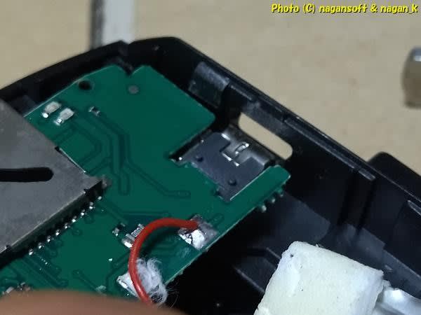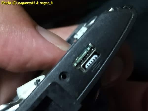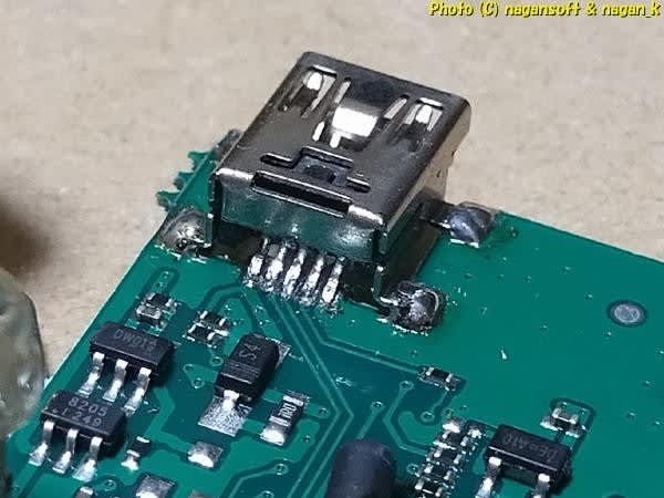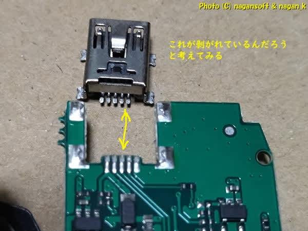 電源コネクタ(USB Mini-B)が基盤から剥がれている。
