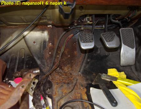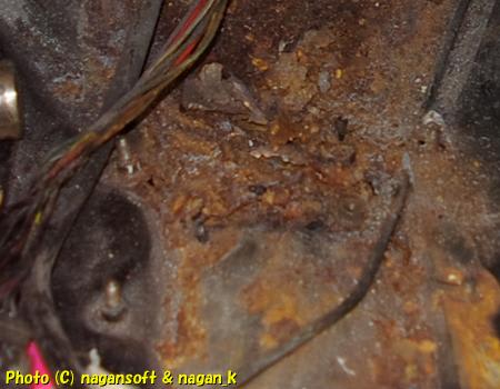 せっかく弄れる状態になったし、現実にサビているし、処置しようということになります。そして、そのトンネルは前席のところにまでたどり着き、そのまま先頭のペダルの横までと続くのです。