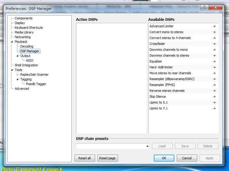 Preferences – Playback – DSP Manager も、再生ソフトで音作りはまだしてほしくないので、なにもActiveにはしない