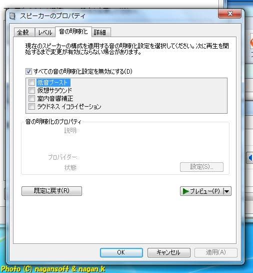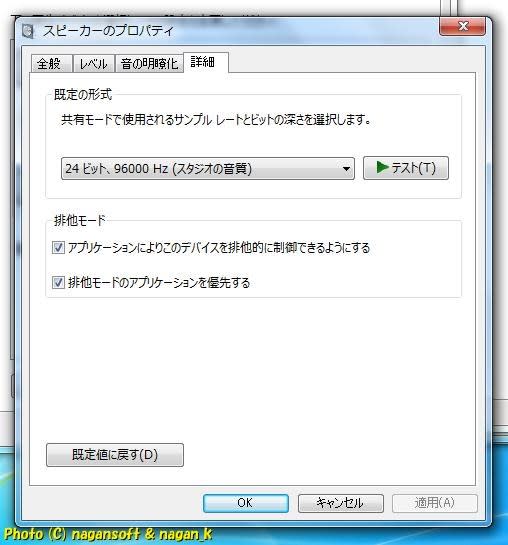 ということで、サウンドプロパティーからの、規定形式を、16ビット44.1K と 24ビット96000 と切り替えて出てくる音の比較です。