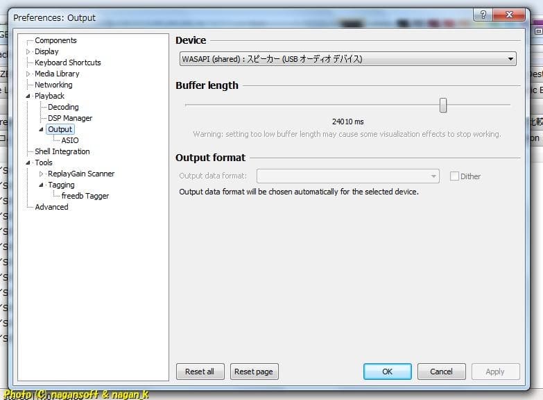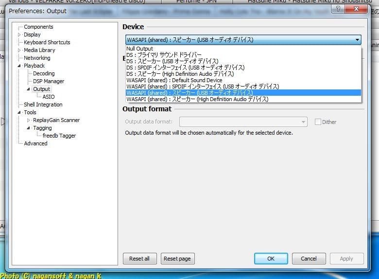 Preferences – Playback – Outpit の Device はこれだけの選択候補があり