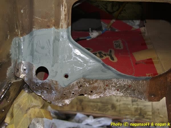 糊代(パッチ鉄板が重なる部分)以外を錆止め塗料(エポローバル)をペタペタと筆塗りしました。