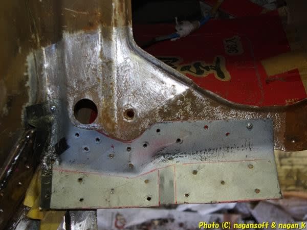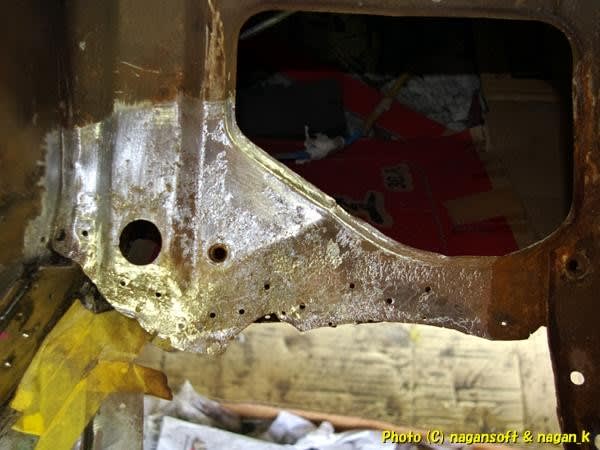 パッチ鉄板との糊代部分と、そこからちょっと上位置まで錆取りしました。