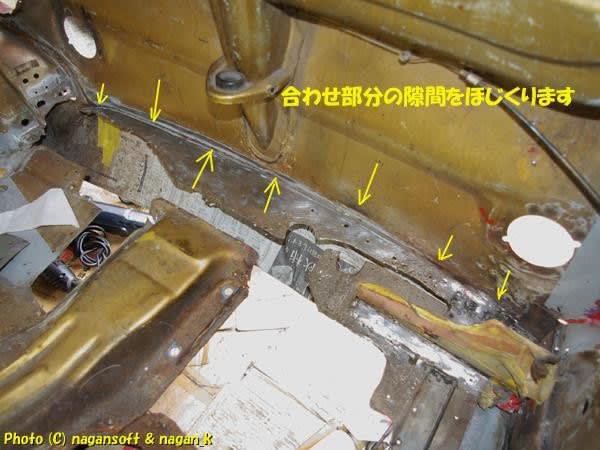 フロントパネルに残ったオリジナル床部分とフロントパネル合わせ面の隙間をほじくります。