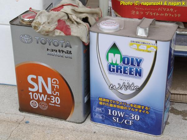 本日のメインオイルは、写真右側の、パルスター株式会社というところが出している「モリグリーンホワイト」10W-30のオイルです。