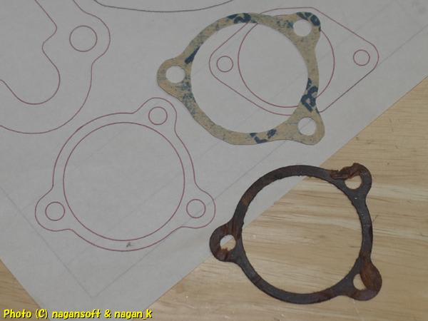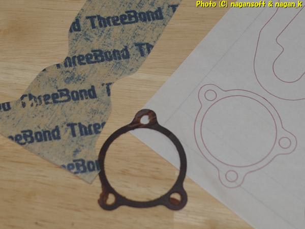 以前に別のパーツを切り出した残りガスケット紙に転写して、ポンチでネジ穴を開けてハサミでサクサクと切り出すだけです。