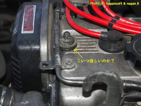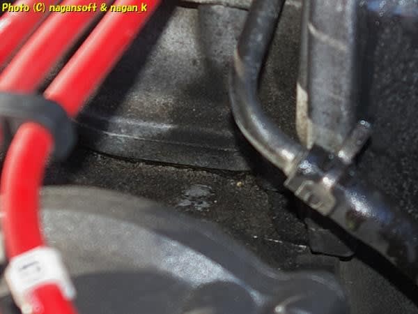 エンジンヘッドカバーです。エンジン前側のヘッドカバー合わせ部分が油汚れになっているんです。