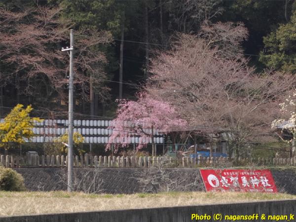 泉佐野陸丘公園を出たら前に見えている意賀美神社を見ますと、小さい枝垂れ桜がピンク色です。