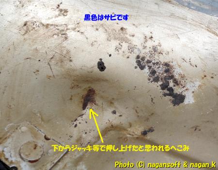 シート下の錆び部分です。ジャッキで押し上げたヘコミもあります。