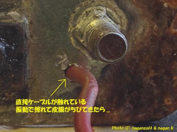 スバルのエンジンはポロンポロンとずーっと揺れるというか車体が揺すられているので、ケーブルが穴の縁に触れて皮膜が破れたらとか考えると恐ろしいでしょ。