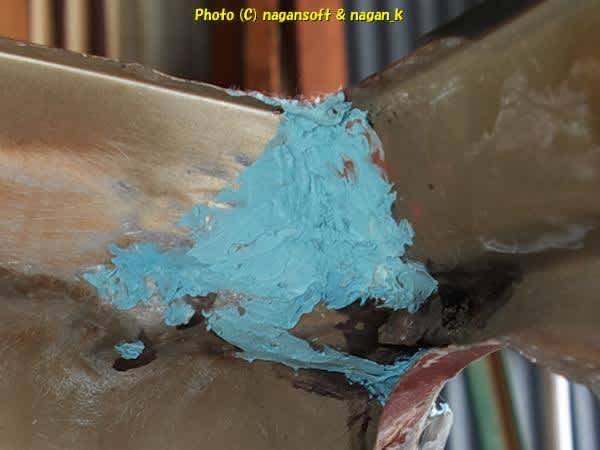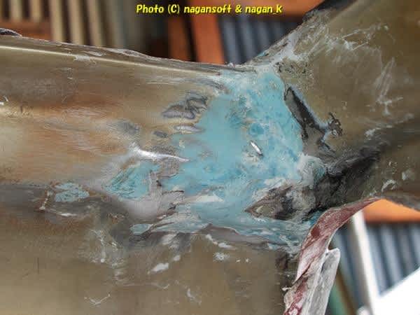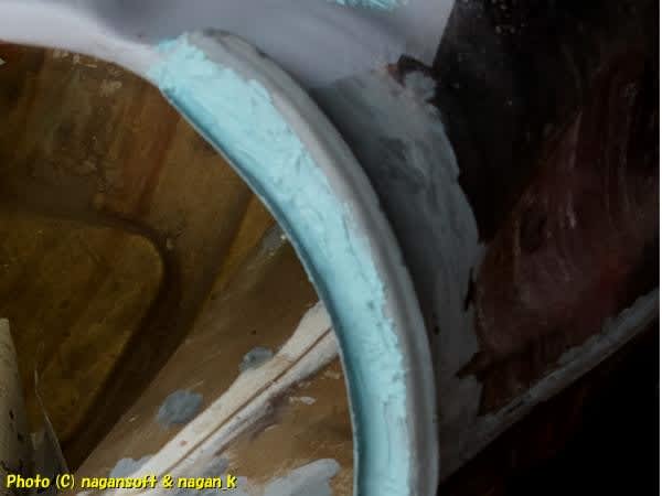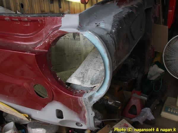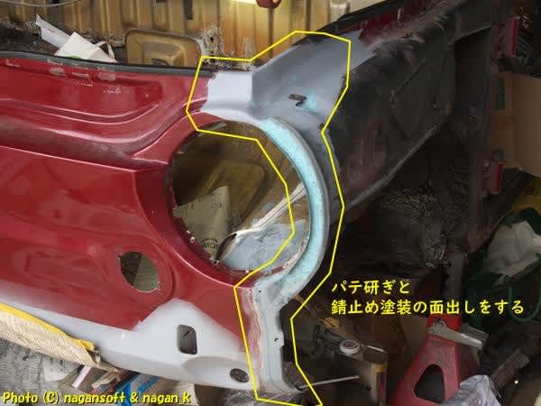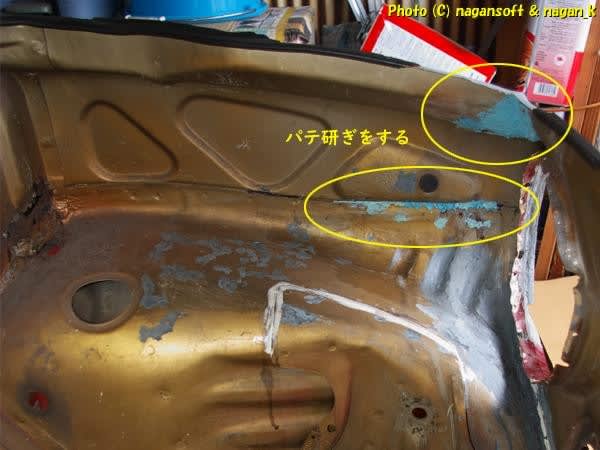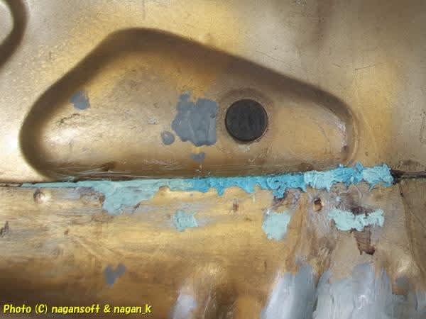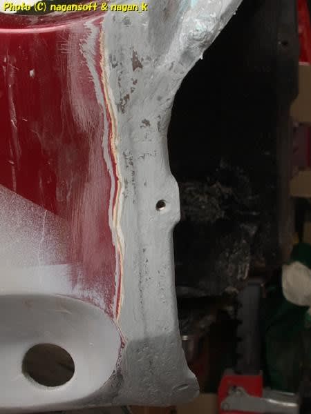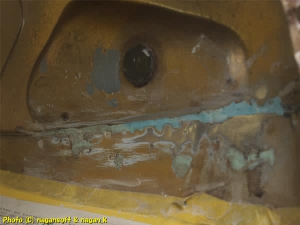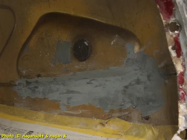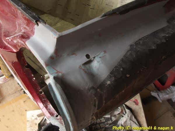 左前上角部分の錆腐れを削り倒してハンダして補修した箇所にパテ盛りしたのはこんなボコボコのままです。