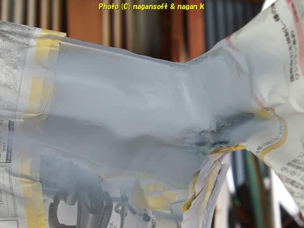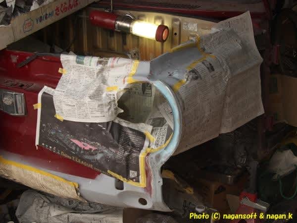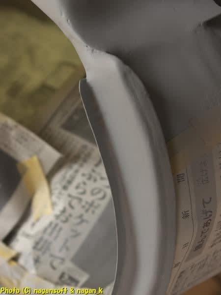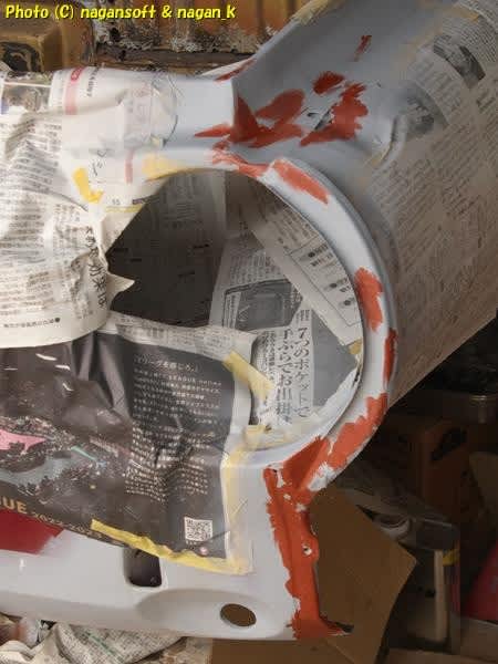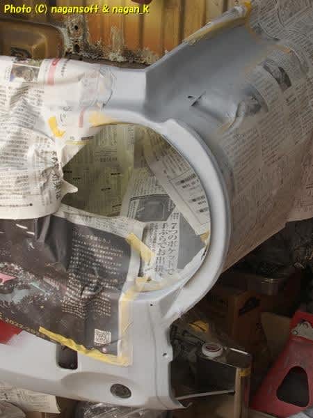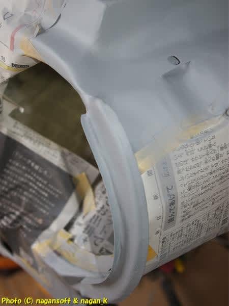 フロントパネルとフェンダー合わせ部分の、パテ研ぎと錆び止め塗料の面出しです。