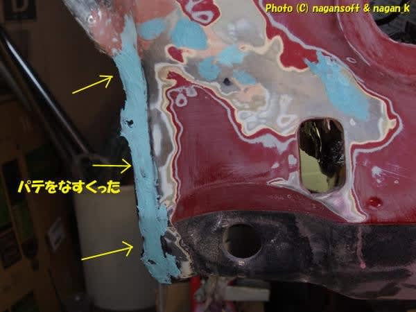 右前フェンダー上トランク縁パテ整形です。