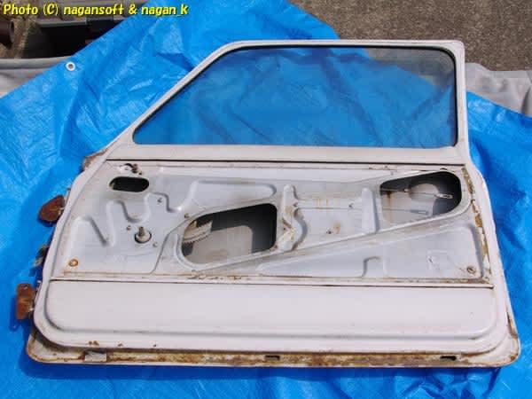 部品提供してくれたSSさんも、「錆と曲がり酷いで、モール穴も塞がなあかんで」と、あまり色よいコメントではなかったのですが….