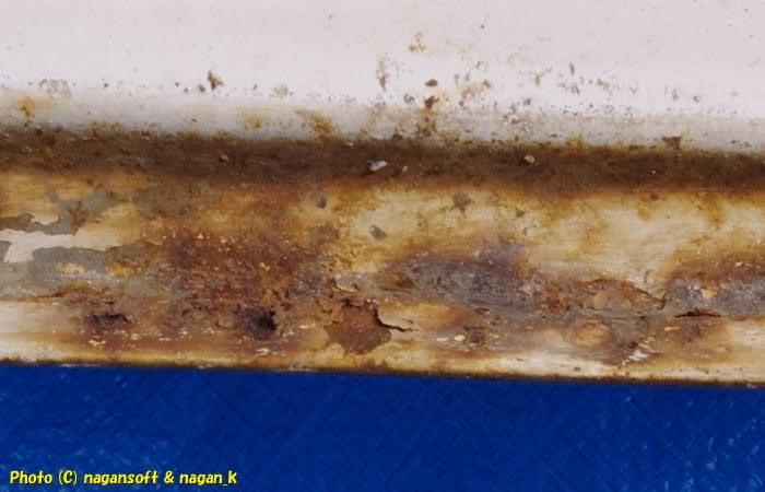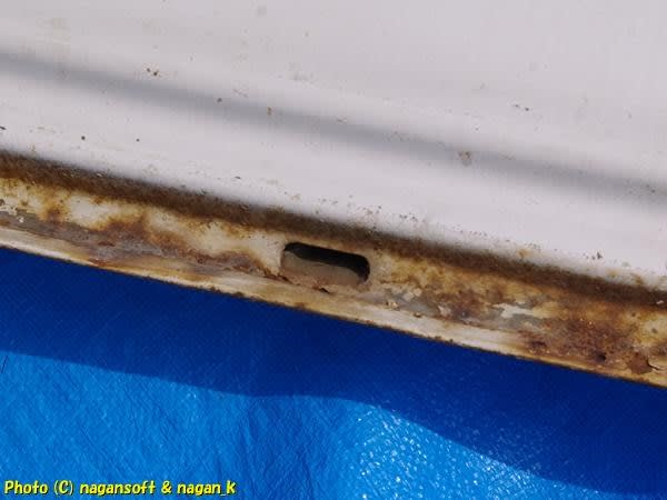 嫌なところに鉄板合わせが膨らんで洞穴があって中に錆のサバンナが見えています。