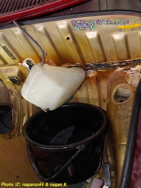 R-2君、ワイパーモーター取り外し、ウオッシャータンク取り外し、トランク内の右フェンダ残り錆屑部分を切除2日目