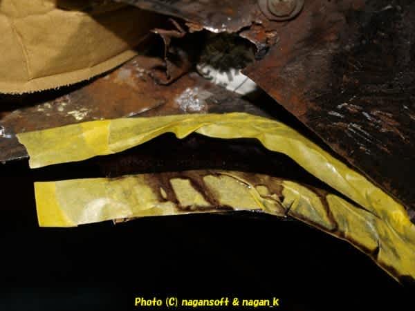 トランク内の右フェンダ切除部分に錆転換剤吹いたところはこんな感じに反応しはじめてます。