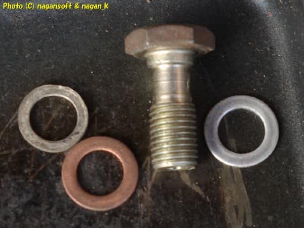 えーと、ボルト頭側はワッシャー入ってましたがエンジン側にワッシャーがなかったのよ。