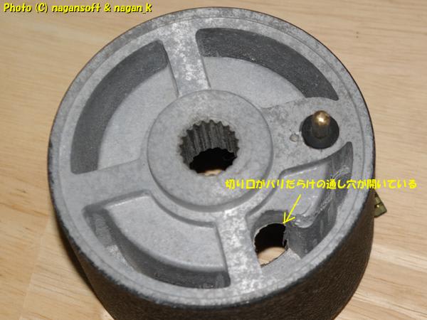 ところで、このボスですが、なにやらケーブル通し穴のようなものが開いてます。この通し穴がバリだらけで危険です。