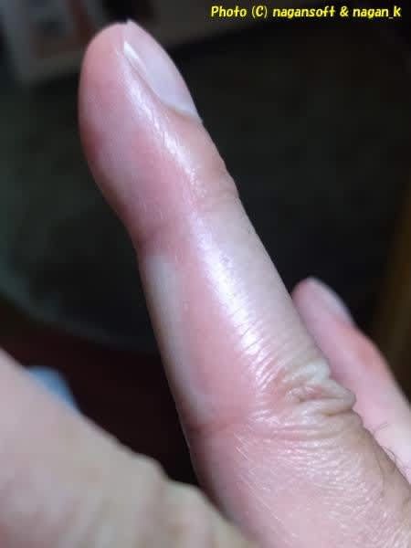 「機械工の手」という症状になる前触れです。このまま放置すると赤いラインのところで本当に小さい水膨れのようなものが出現して皮が剥けていくんよ。