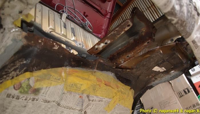 車体下から見て室内床とトランク床の接続部分を錆取りします。
