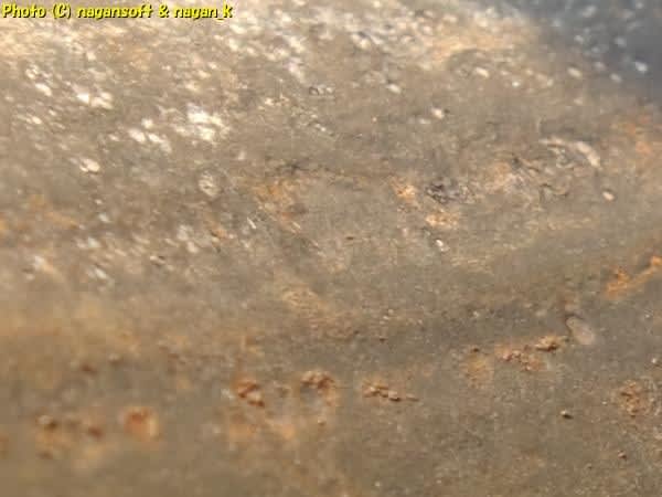 まずはスプーンで擦り取ってみます。大きいブロックのような鎧錆は取れました。