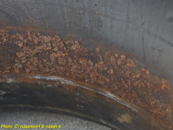 石鹸水+洗車ブラシ、歯ブラシ、セメント洗いブラシ、とシコシコやってみますが錆の食いつきは凄いです。取れませんよ。