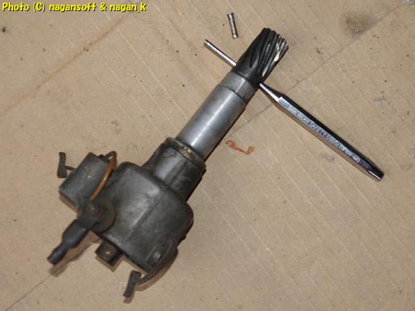 エンジンコンディショナーを拭いて歯ブラシ掃除して、CRC556をくれてやって、マイナスドライバーでこじって。の工程を繰り返して、マイナスドライバーの先幅より広くなったところで、デスビをハンマーで軽く叩きながら残りを抜き取りました。
