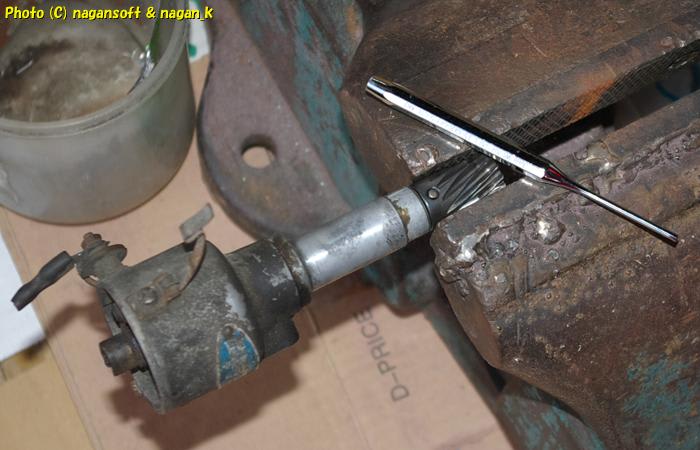 もちろんCRC556をくれてやって、ハンマーでドリブンギアを「元気ですかー」と軽く叩いて、今度はドリブンギヤを万力に挟んで、デスビを両手で握って引っ張るのですがまったく反応なし。