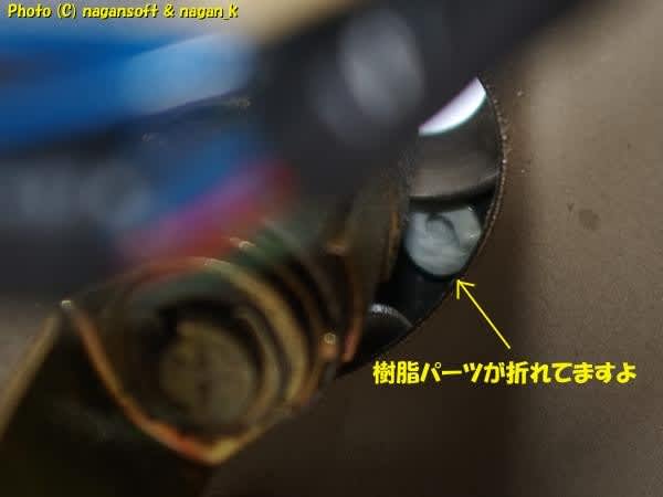 なんで脱落しているのん?ってよーく見つめるまでもなく、樹脂パーツが割れているのがわかりました。