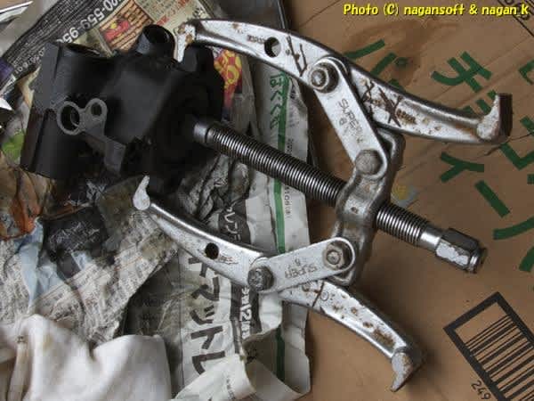 プーラーをかけてハウジングキャップを押し込みます。ちなみに、自動車整備工場だとプレスを用いる作業だと思います。私は「憧れのプレス」は持っていません。だって激貧家庭ですから…。はあーっ、プレス欲しいなー。
