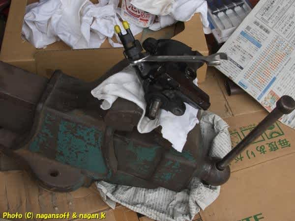 ちなみに、万力を地べたに転がして使用するのは間違った使用方法です。レンチの柄をパイプ挿して延長も間違った使用方法です。怪我をしたくない良い子は真似をしないように。