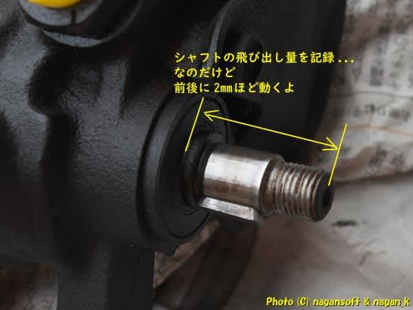よしっ、プーリーが抜けたぞ。で、シャフトの飛び出し量を記録することに….
