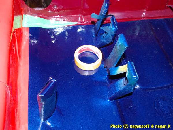 ちなみに、この黒の上には、蛍光ピンク色のヒーターダクトが横切るのです。ヒーターダクトを固定するブラケットは黄色なんですよ。(まだマスキングされたままです。それを剥がすと黄色が出現するんですよ)
