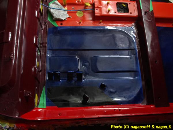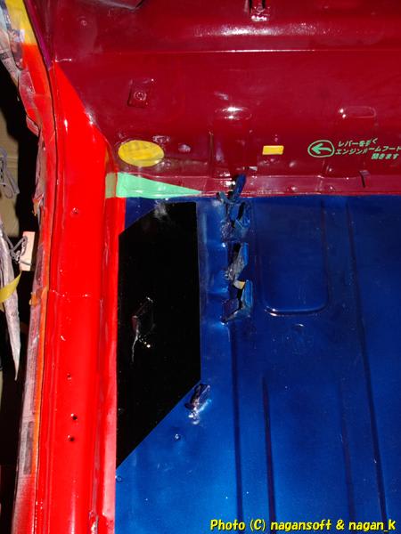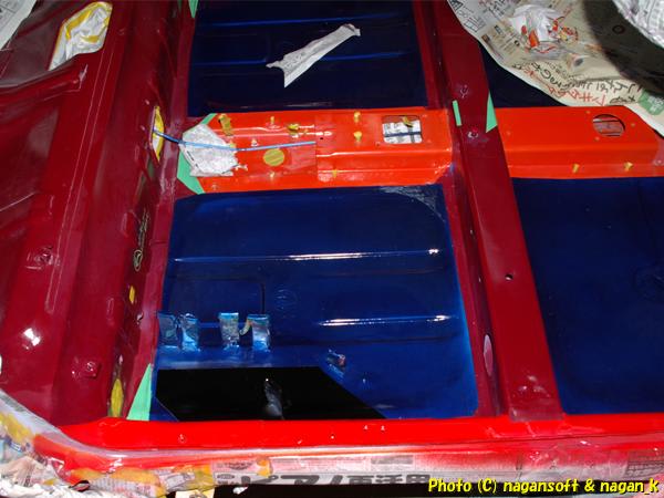 エンジンルームの手前側はもちろんボティー外装と共色にするのですが….