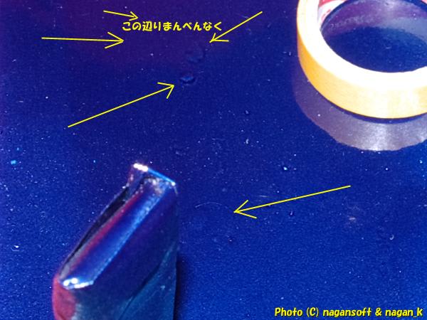 ドライヤーで強制乾燥です。溶剤成分を飛ばしてから、シンナーを含ましたウエスで拭き取りしまして、またやり直しです。
