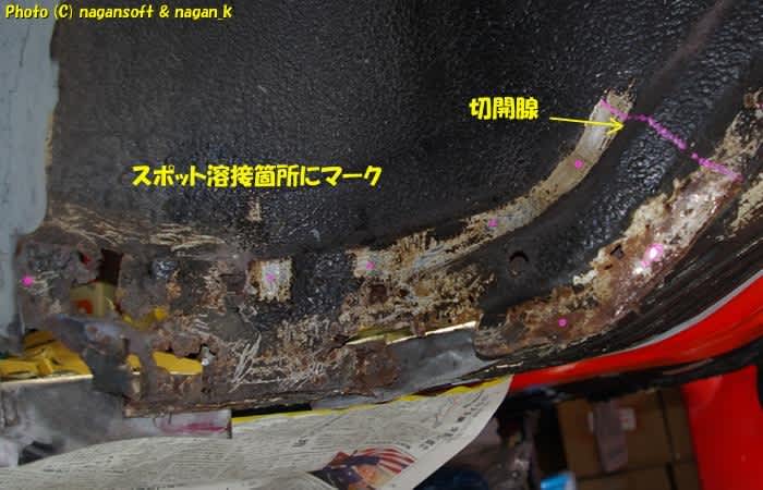 スポット溶接箇所と、切開腺をマジックで印つけます。