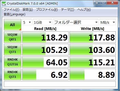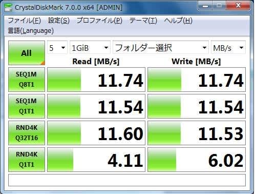 別PC(もちろん1000BaseTで接続)から、ネットワーク共有領域に書き込みして速度計測です。書き込み速度計測は、その手のベンチマークソフトで有名なCrystalDiskMarkを用います。