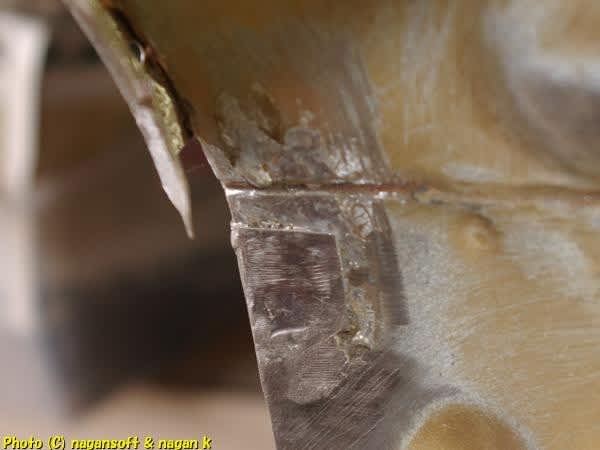 ブリキバサミとグラインダーにて切除整形しまして、はみ出しがなくなったのを確認です。